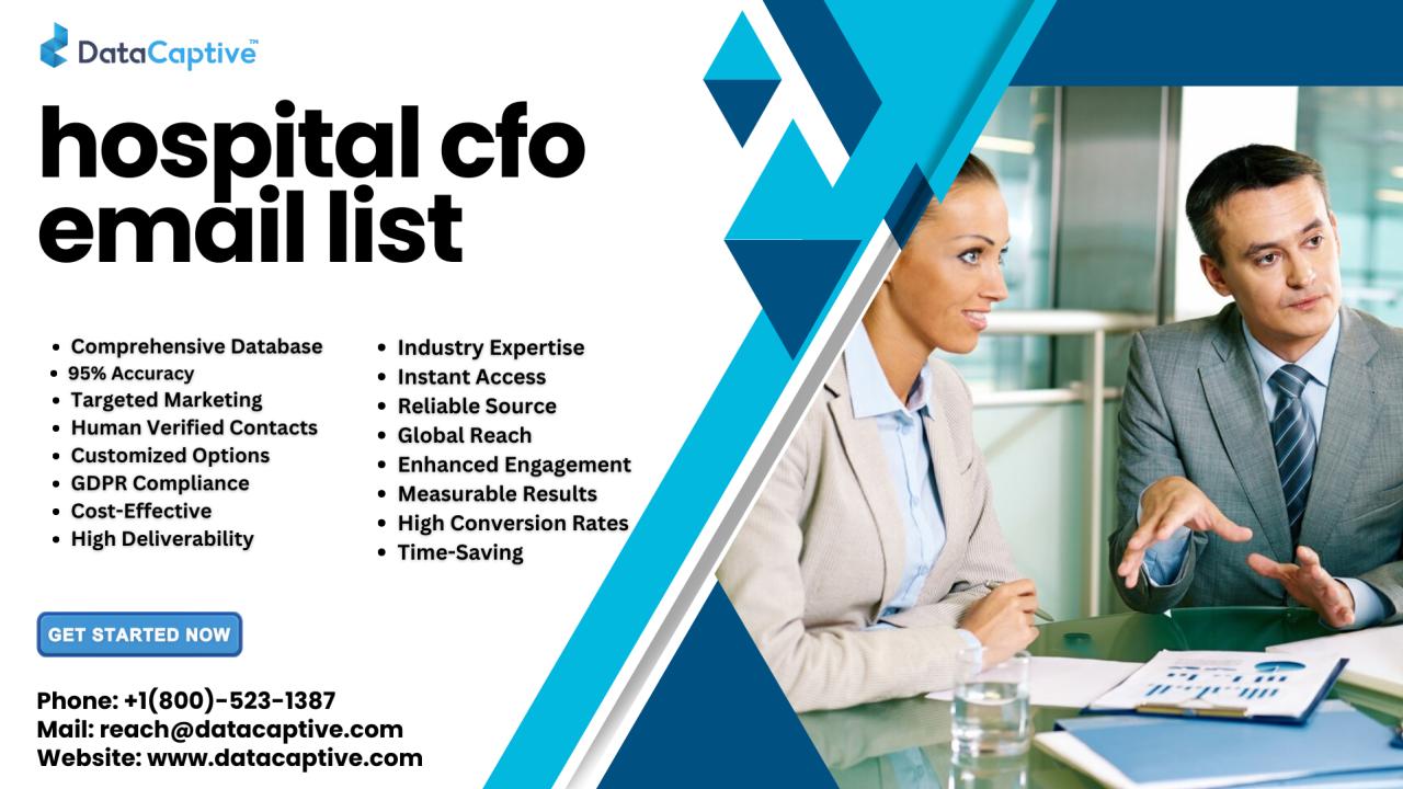 Reach Hospital CFOs directly with DataCaptive’s verified Hospital CFO Email List.Our opt-in data allows you to connect with the top financial decision-makers in hospitals and healthcare organizations, ensuring your campaigns..