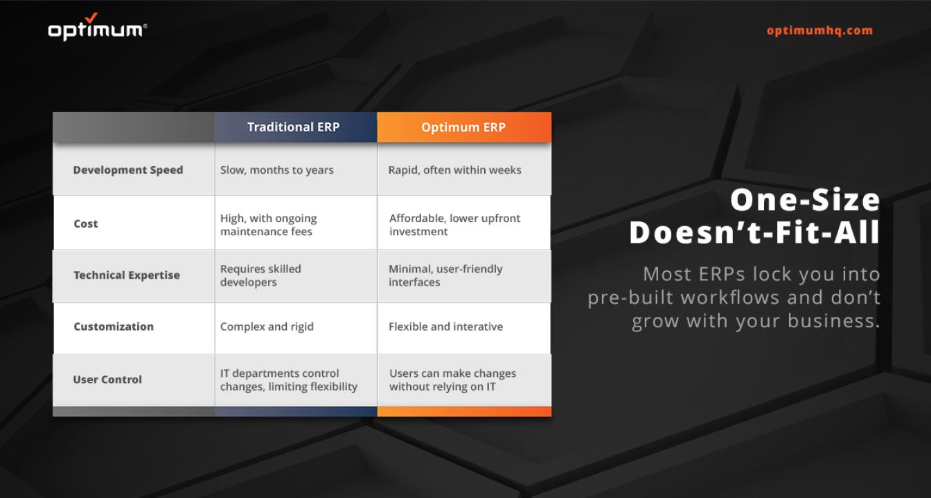 Manufacturers face unique challenges that require tailored solutions. A custom ERP system addresses these needs, streamlining production, inventory, and collaboration. Embrace this technology to enhance efficiency, profitability, and scalability. Would you like to learn more about how Optimum Custom ERP can transform your manufacturing business? Contact us and discover tailored solutions designed for your success.