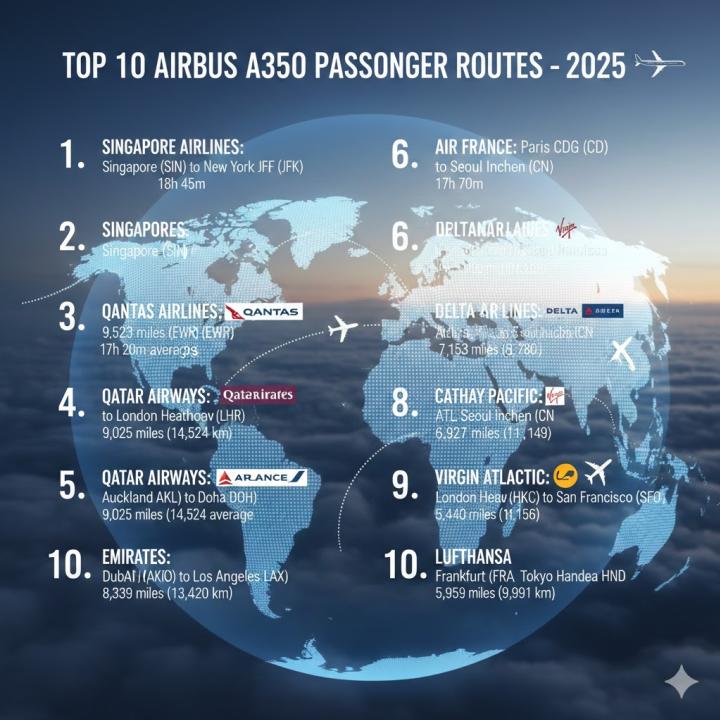 ✈️ Top 10 Longest Airbus A350 Passenger Routes in 2025 🌍