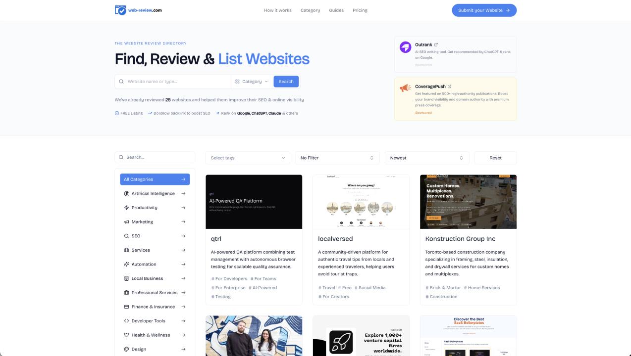 Web-Review.com is a comprehensive online business directory and website review platform designed to help companies improve their online presence, search engine visibility, and brand credibility. The platform serves as a centralized hub where businesses, startups, SaaS companies, agencies, and digital services can submit their websites to a structured business directory, making it easier for potential customers to discover reliable companies and innovative solutions across different industries.