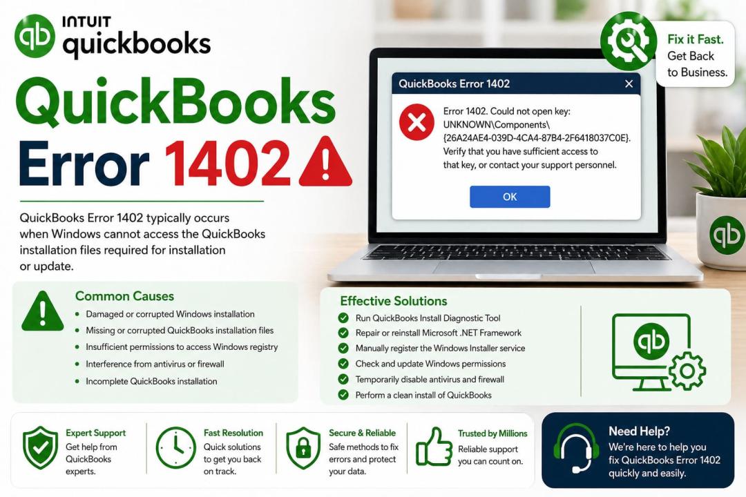 QuickBooks Error 1402 shows "Couldn't Open Key" during installation, updates, or opening company files. This registry error blocks QuickBooks Desktop on Windows. Here's how to fix it permanently.