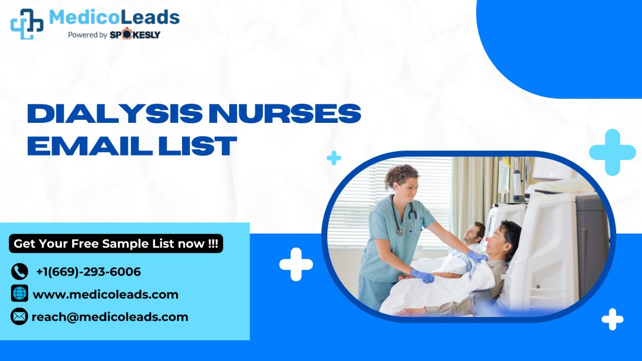 MedicoLeads B2B database providers offer a kidney care nursing directory focused on dialysis unit professionals. From nephrology clinics to hospital-based dialysis wards, this contact database is curated for companies offering renal care equipment, medication delivery tools, or workflow software aimed at high-acuity nursing environments.