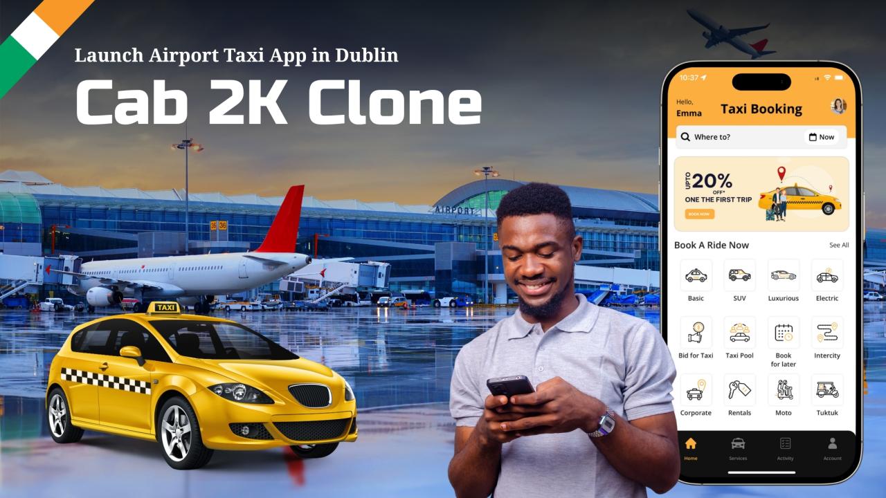 The Cab 2K Taxi Clone app powers your car services at Dublin Airport to help you create a flexible, effective, and user-friendly solution.
