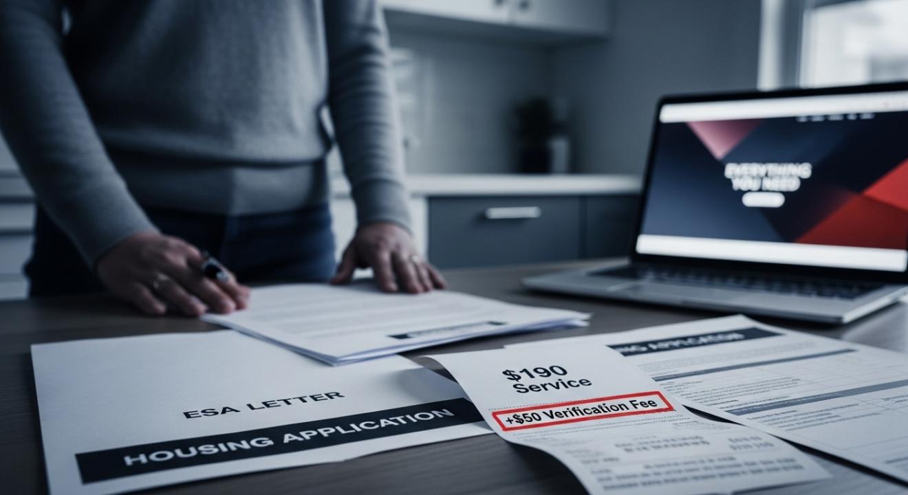 In confirmation emails: "Your ESA letter is ready" "Use this for housing accommodations" No mention of potential verification costs